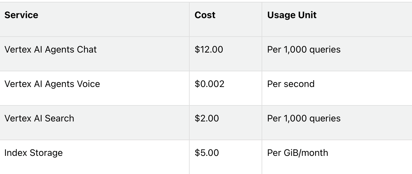 Vertex AI Agent Builder: Pay-as-you-go model starting at $12/1,000 queries (Chat) and $0.002/second (Voice). Includes a $1,000 free trial credit. Ideal for enterprises with fluctuating needs.